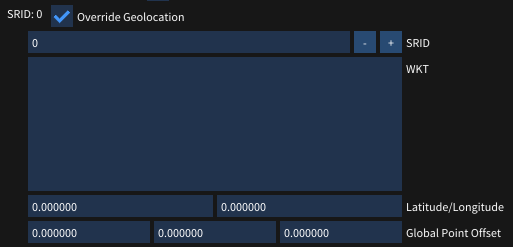 Optional Selection: Override Geolocation If the source data has been correctly geolocated, when you import that file prior to converting it, the file should already have the "Spatial Reference Identifier" (SRID) information filled in this box: search for "EPSG code" or "SRID code" in the metadata. The SRID is the Geotagged ID of the GIS zone for the exported model. If the pre-parse can detect the SRID it will be set automatically. If not, and you wish to correctly geolocate your data, then you can manually select the "Override" checkbox and enter the correct SRID in the text field. It assumes that the input is already in the correct zone. Global Point Offset can be used to add an offset to the x, y and z coordinates of the converted model from that which was specified in the file's metadata, or if not, from the global origin (0, 0, 0).