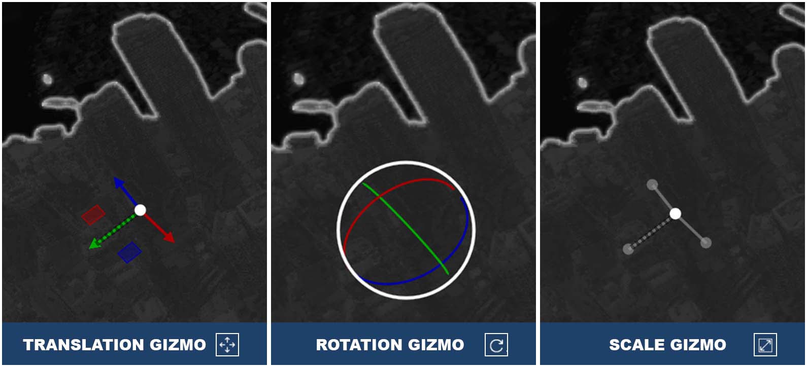 A "gizmo" is used to move objects around in the scene. When active, the gizmo appears at the origin of an item. Gizmos are disabled by default.