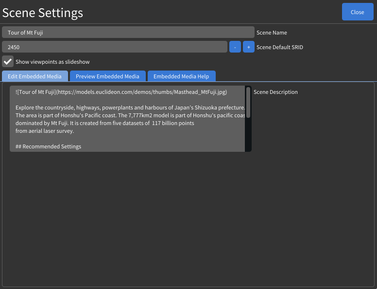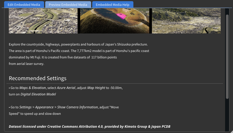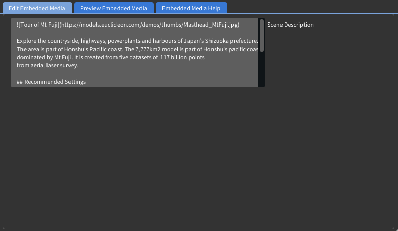 udStream supports Markdown script for creating project information. You can edit your Markdown script and browse effect in "Edit Embedded Media".