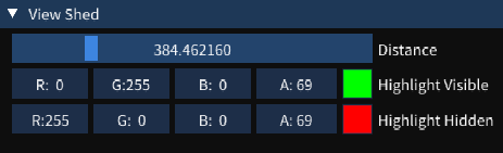 Expanding the viewshed in the Scene Explorer shows the distance and colour settings described above. The Gizmo can be used to reposition the viewshed origin.